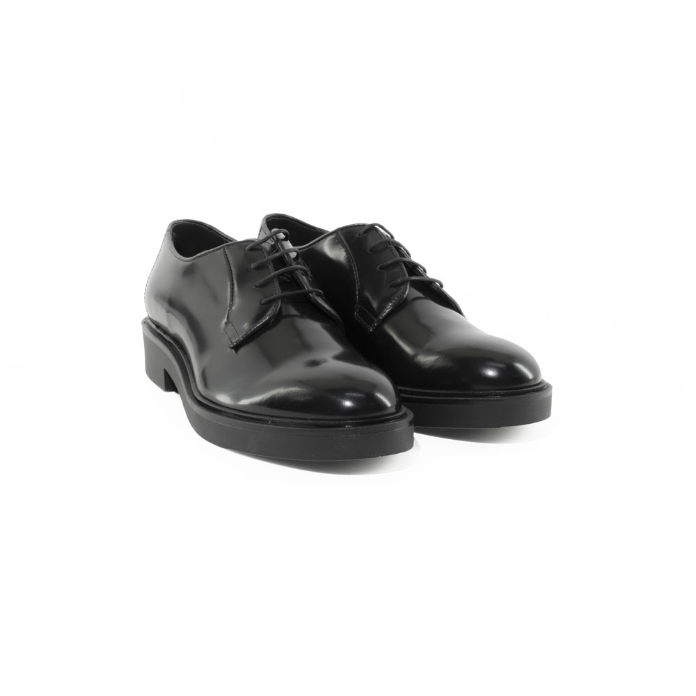 Scarpe basse allacciate in pelle effetto lucido, tinta unita, punta arrotondatatonda. Interno in pelle, suola in gomma.