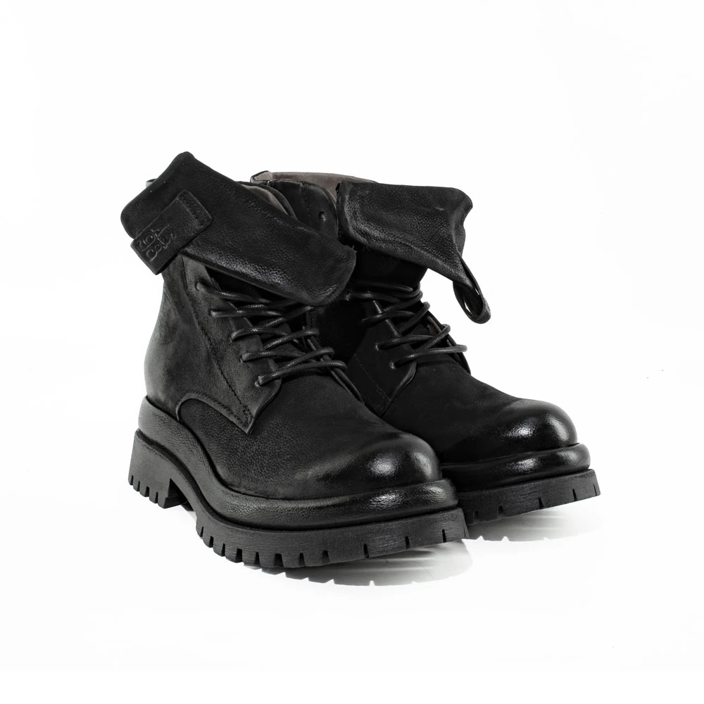 Stivaletti anfibi in pelle della linea Dibla: rivisitazione più moderna dei classici anfibi. Caratterizzati dalla forma grintosa e arrotondata. Fasciatura in pelle bombata sulla suola con effetto carrarmato. Linguetta asimmetrica.