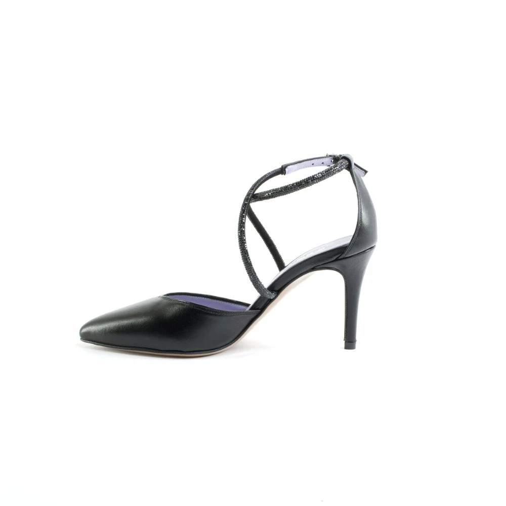 Décolleté con tacco a spillo e punta affusolata. Laccetti regolabili ricoperti di strass incrociati sul collo del piede. Vera pelle, made in Italy