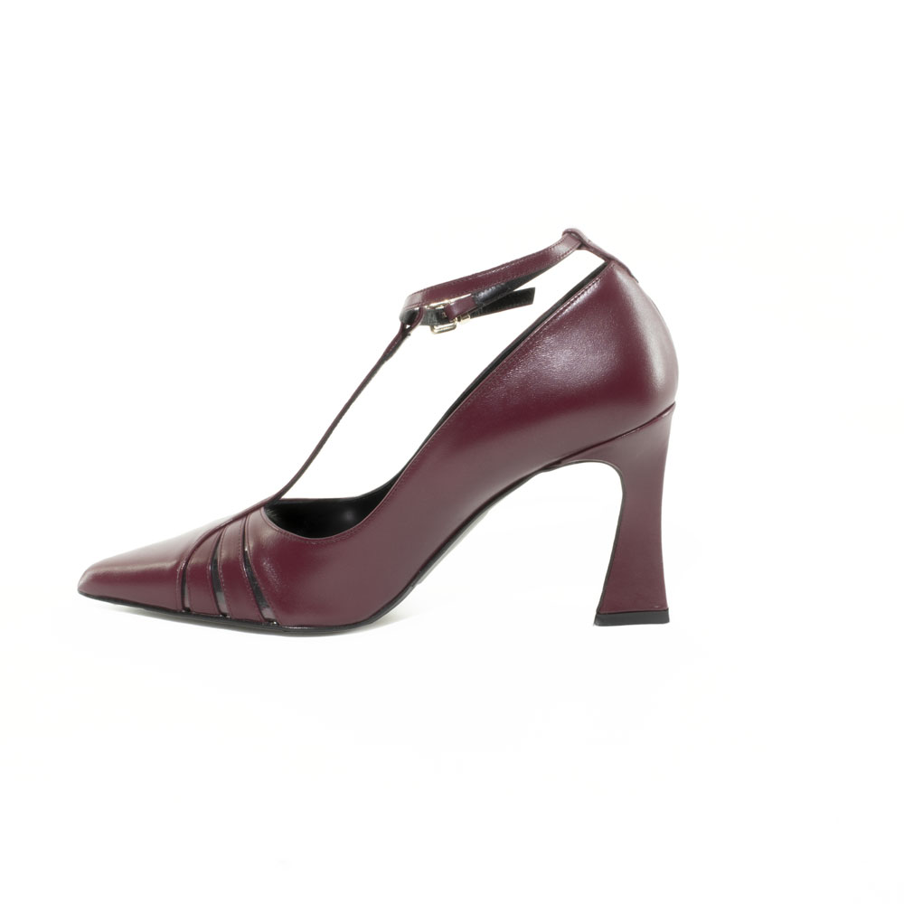 Pumps realizzate in morbida pelle con silhouette affusolata e T-bar. Tacco a rocchetto 9 cm.