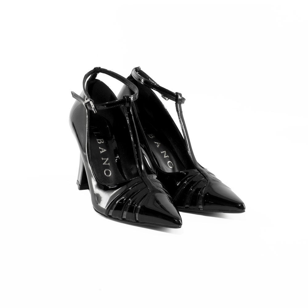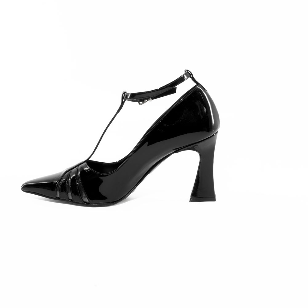 Pumps realizzate in morbida pelle con silhouette affusolata e T-bar. Tacco a rocchetto 9 cm.