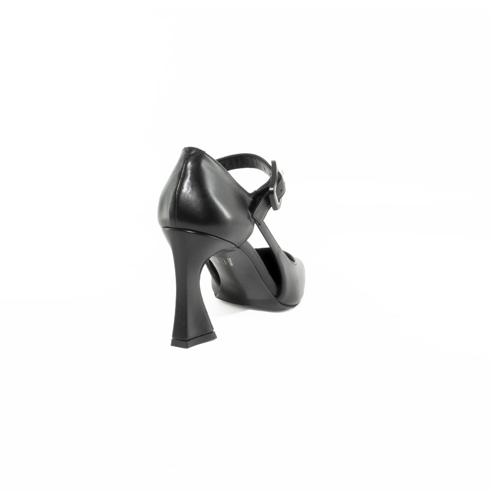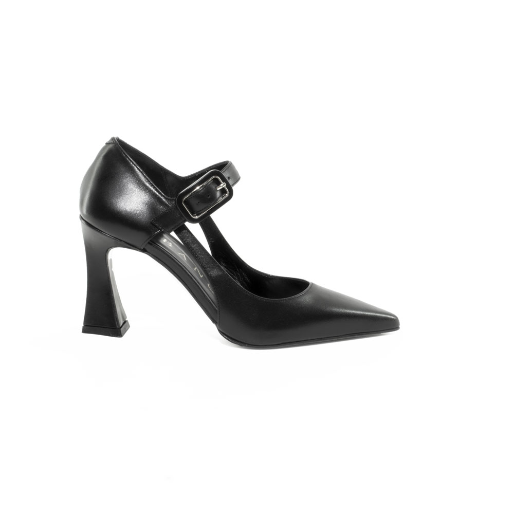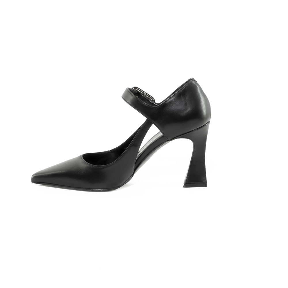 Pumps realizzate in morbida pelle con silhouette affusolata e cinturino sul collo del piede. Tacco a rocchetto 9 cm.