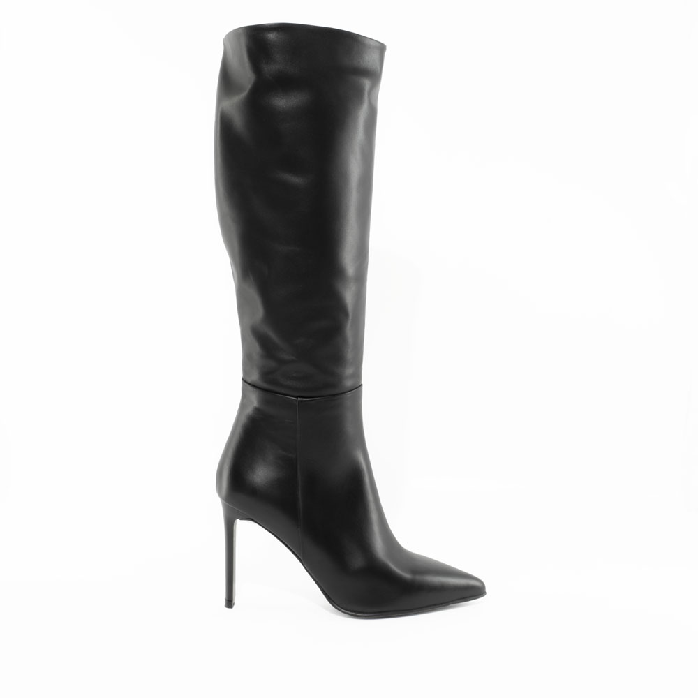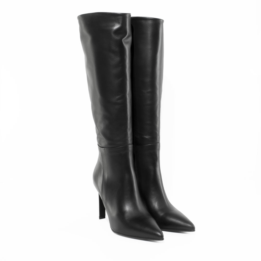 Stivali alti sotto al ginocchio realizzati in morbida pelle. Linea dritta e pulita con punta affusolata e tacco sottile.