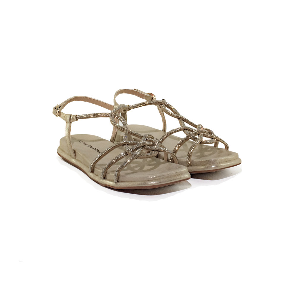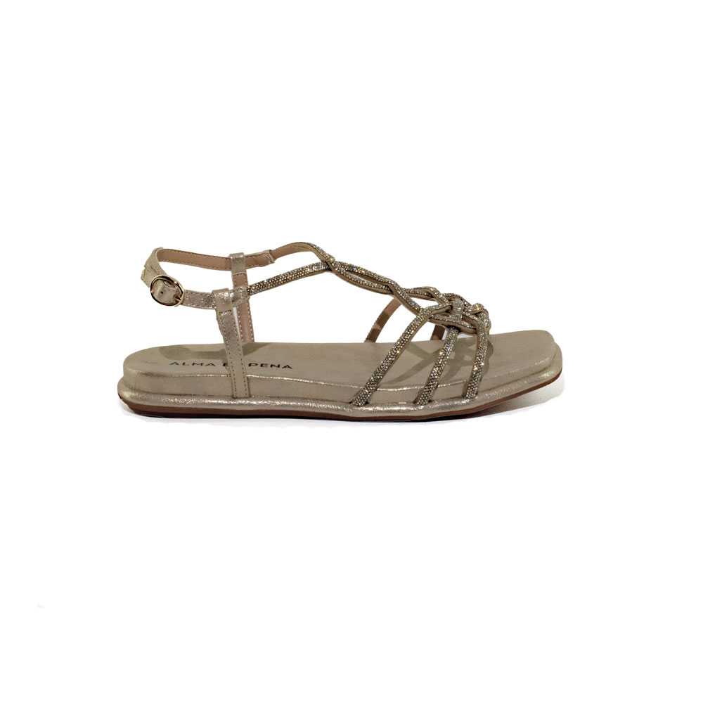 Sandali realizzati in pelle con applicazioni di strass, chiusura con laccetto regolabile, punta squadrata, texture scamosciata. Plantare ultra soft.