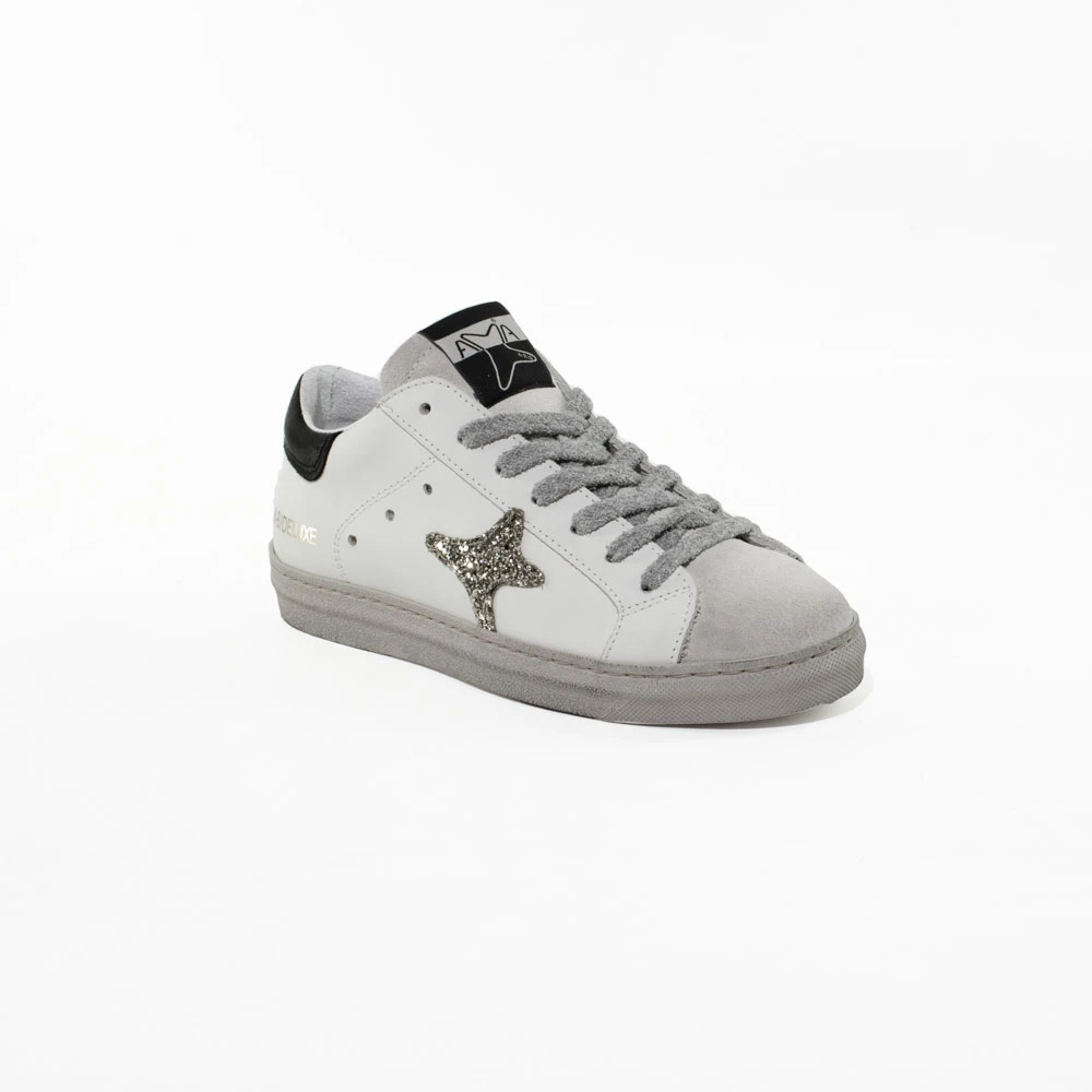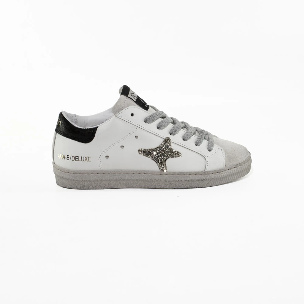 Sneakers Ama Brand, in pelle colore bianco con dettagli glitter platino e blocco nero sul tallone