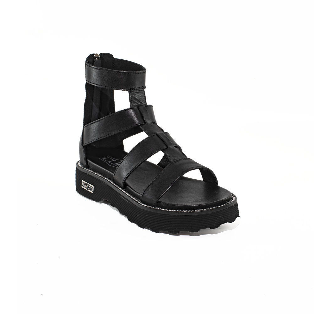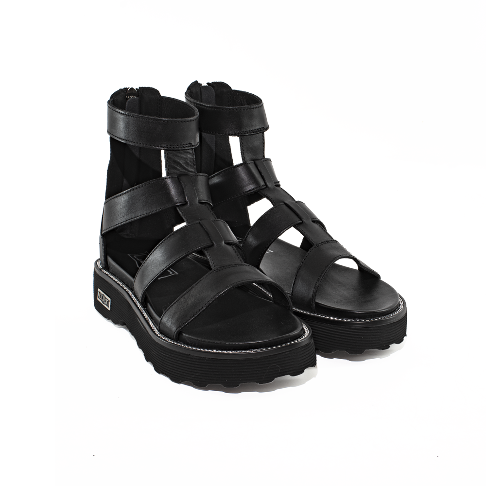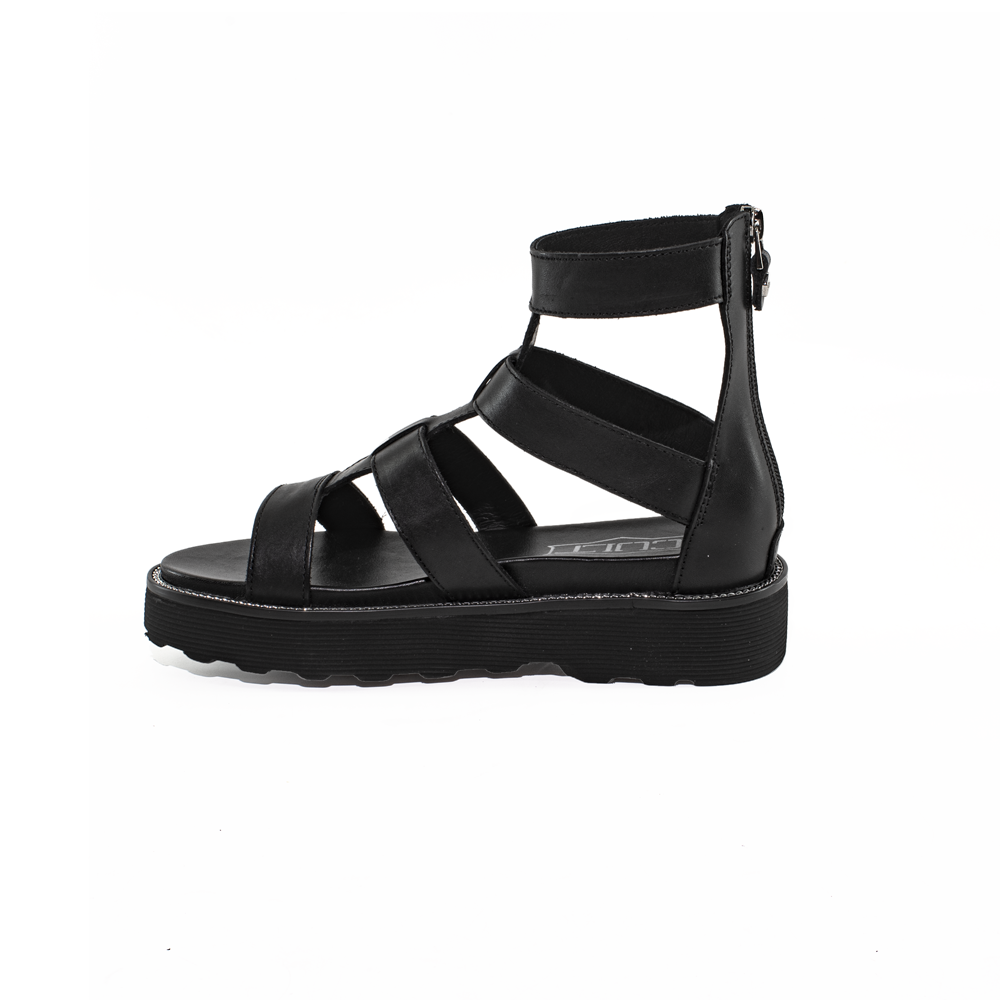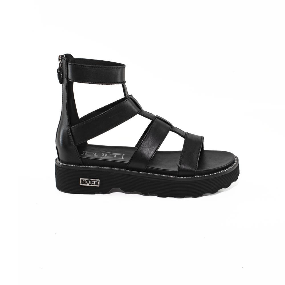 Sandali platform firmati Cult, realizzati in pelle nera con zip alla caviglia, fondo in gomma nero