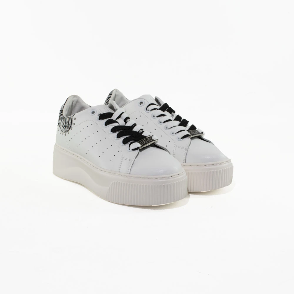 Sneakers in pelle con blocco sul tallone zebrato e micro borchie argentate per un effetto davvero glamour. Un mix moderno e d’effetto, ideali per questa nuova stagione!