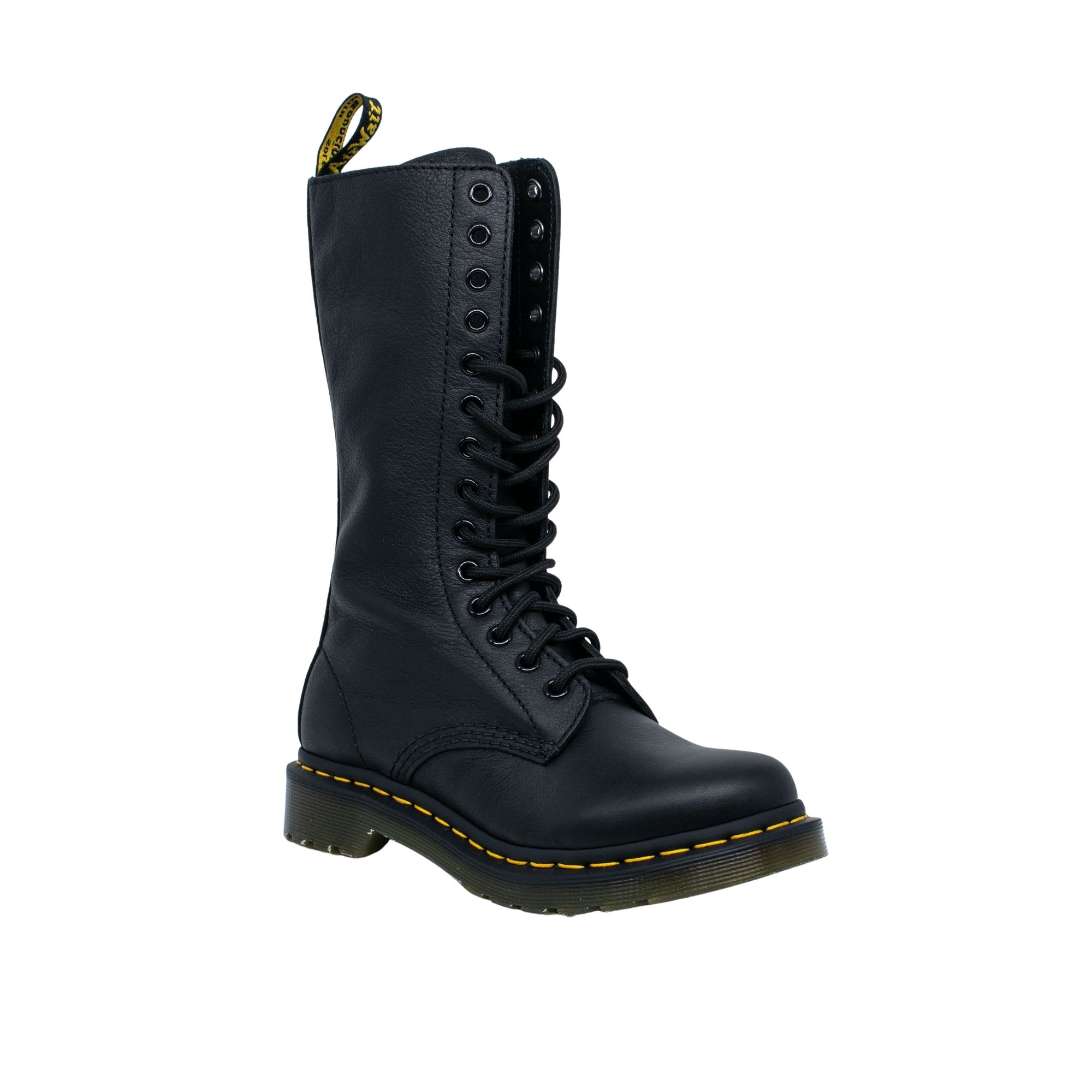 Anfibio Dr.Martens unisex in morbida nappa nero, 14 fori con lacci neri, fodera pelle , cuciture a vista gialle, forma rotonda .