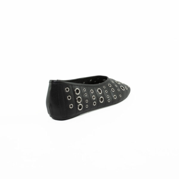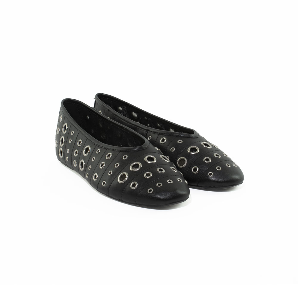Ballerine dal design flat realizzate in pelle traforatacon aplicazioni metalliche. Cinturini regolabili. Soletta imbottita in pelle, fondo gomma.