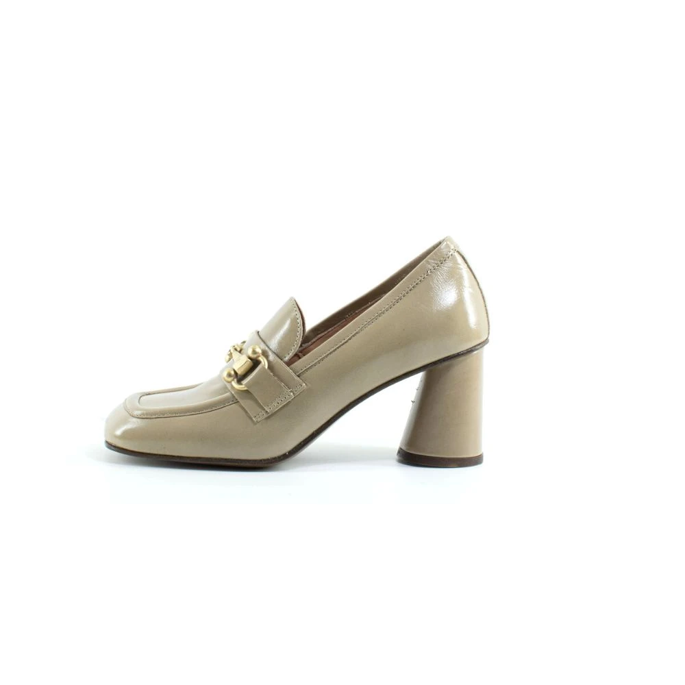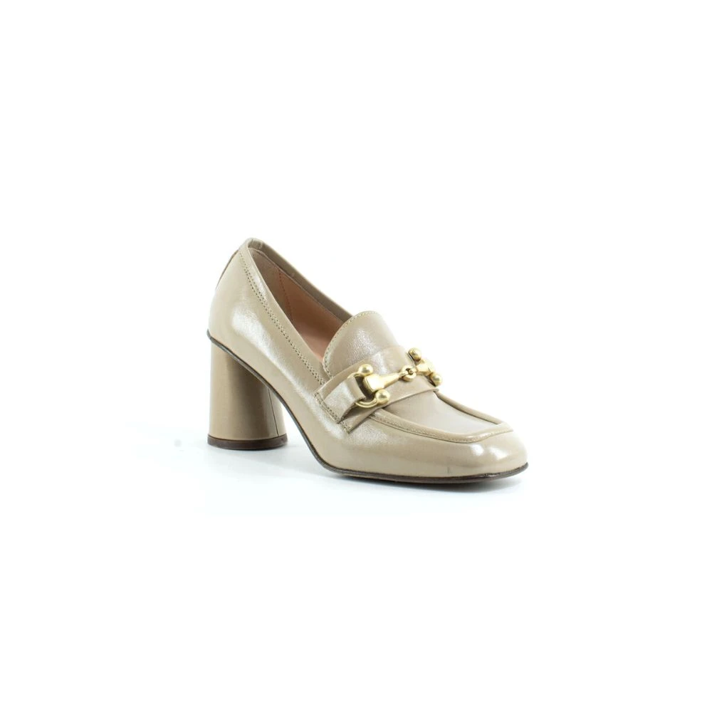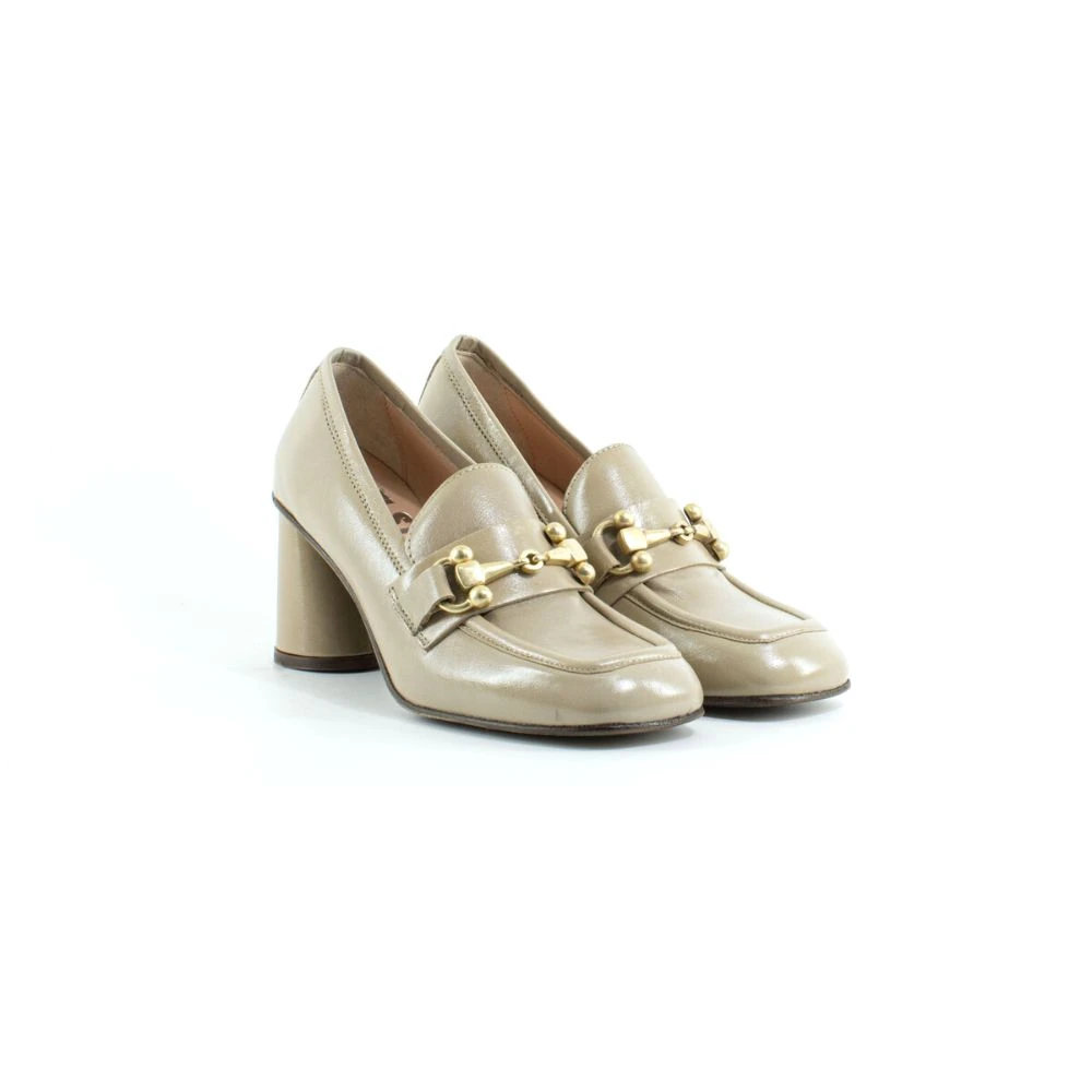 Mocassini realizzati in morbbida pelle con morsetto colore oro e montati su un comodo ed elegante tacco medio.