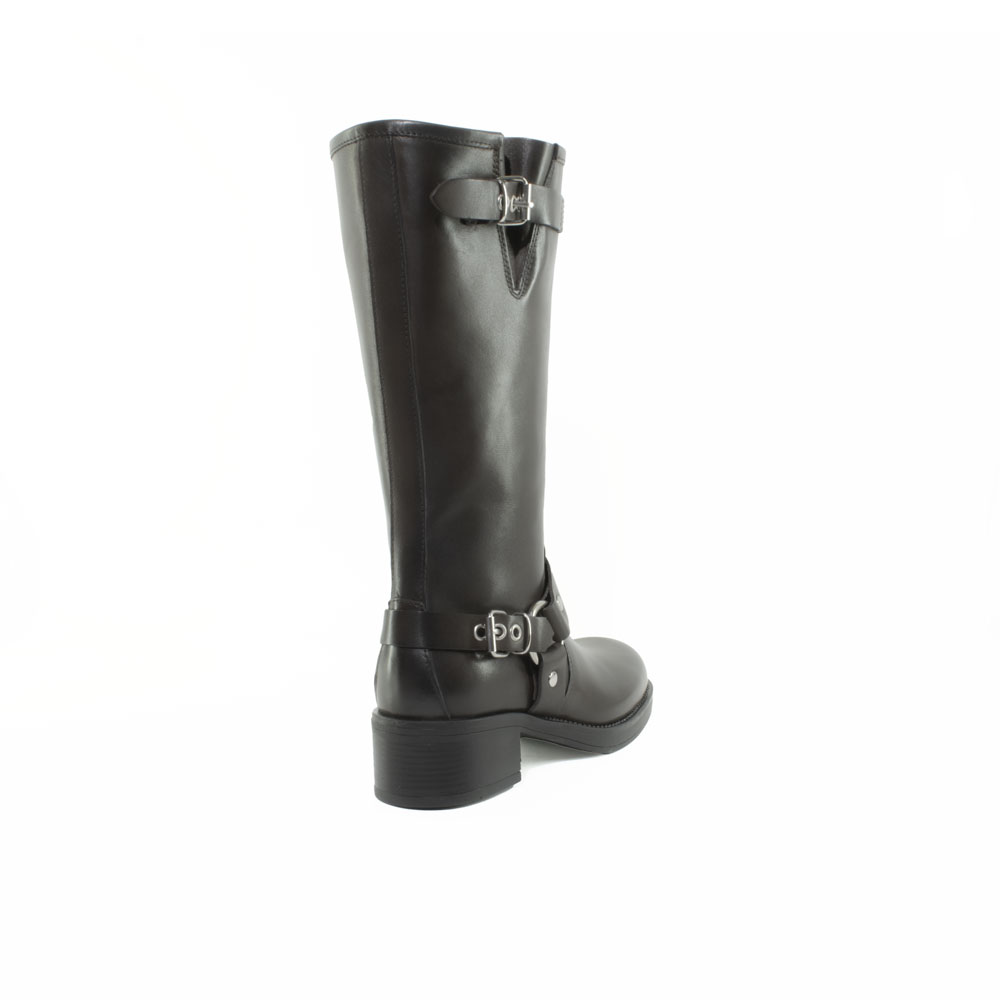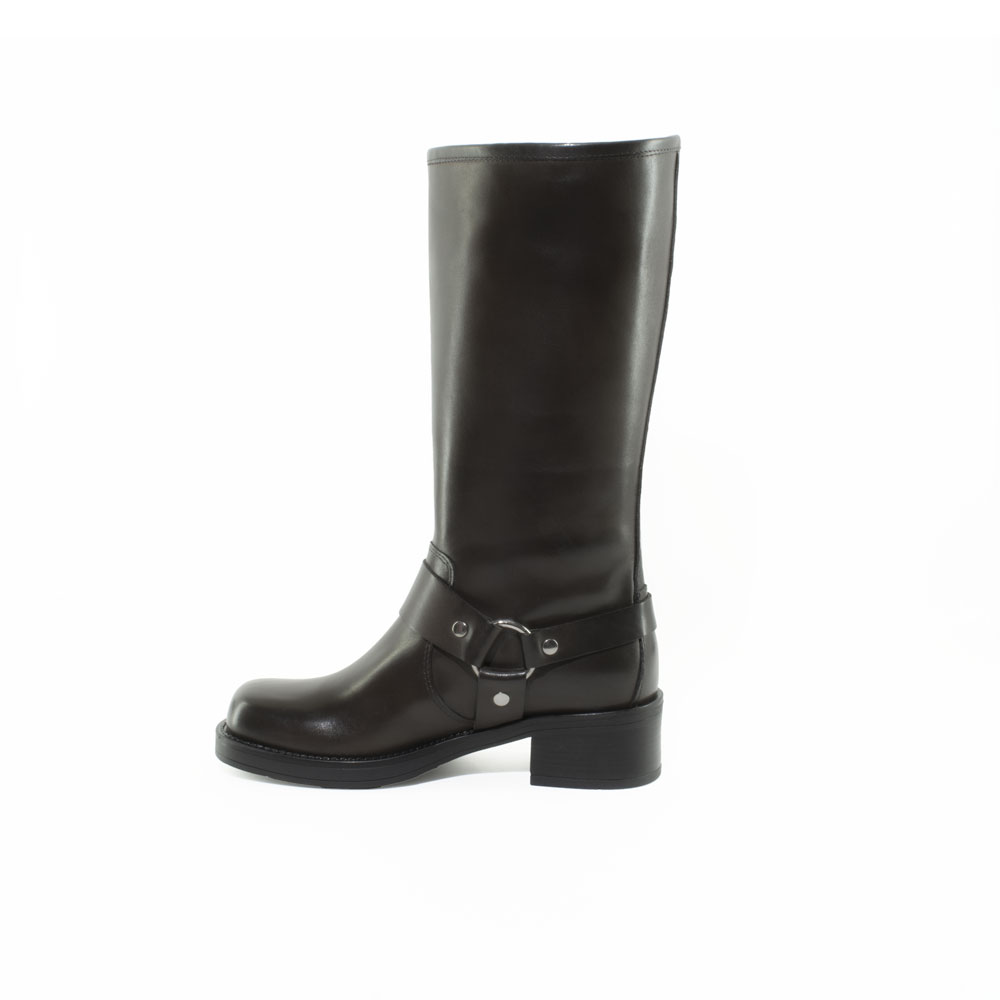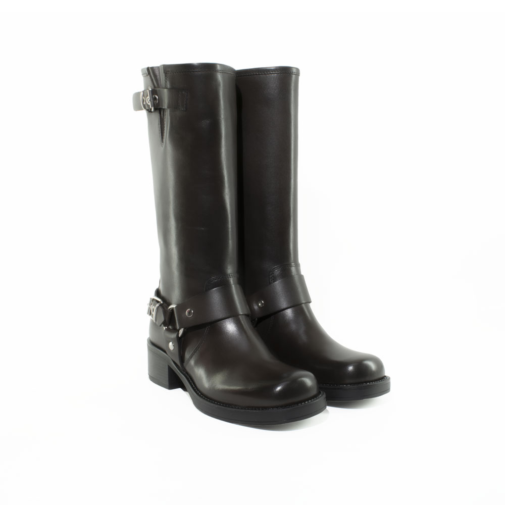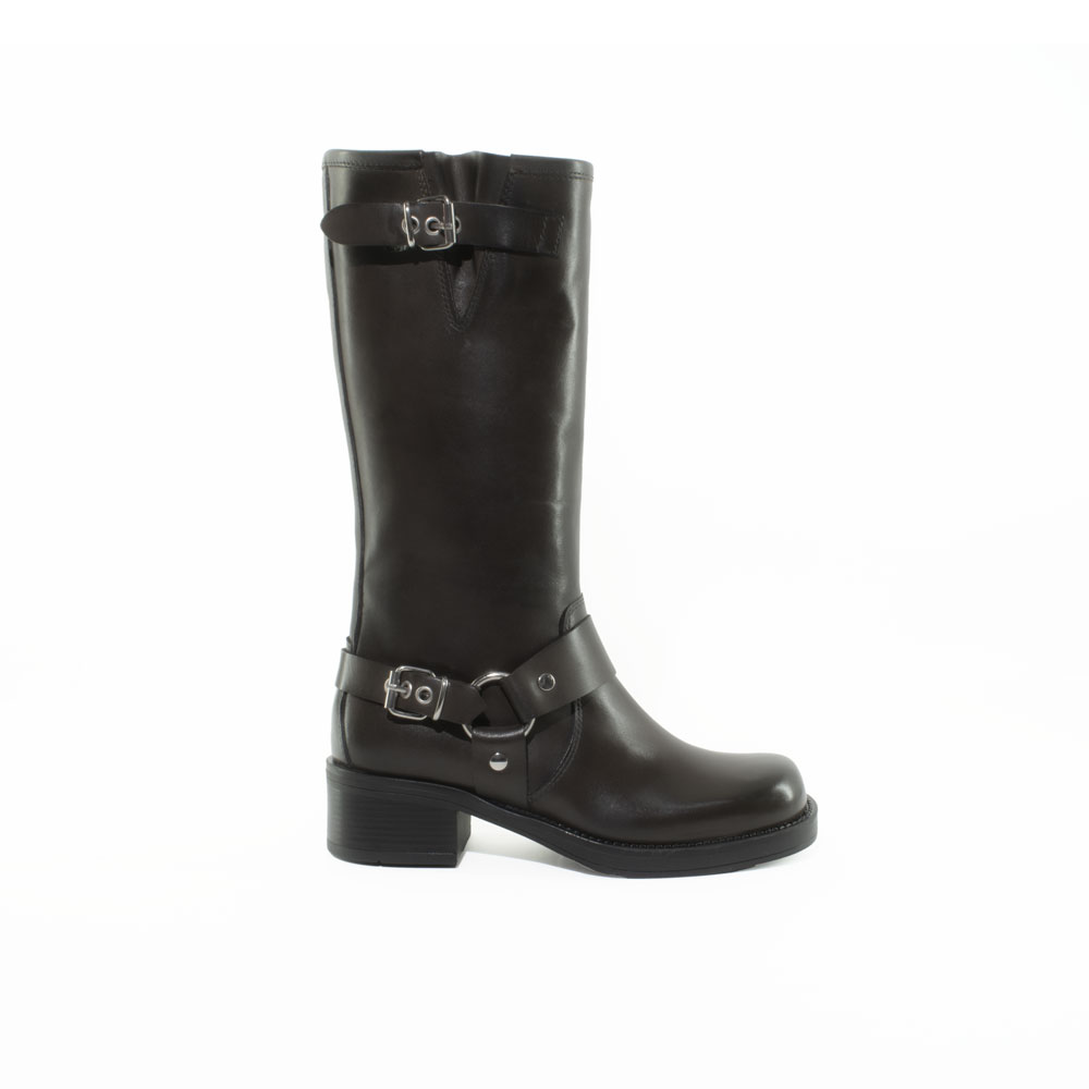 Iconico modello biker realizzato in pelle, ideale nella stagione invernale da abbinare anche a maxi abiti. Caratterizzato da fibbie e borchie in argento satinato.