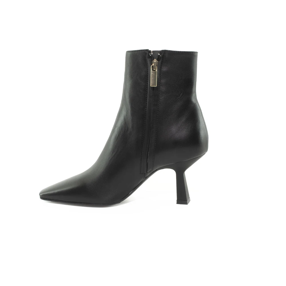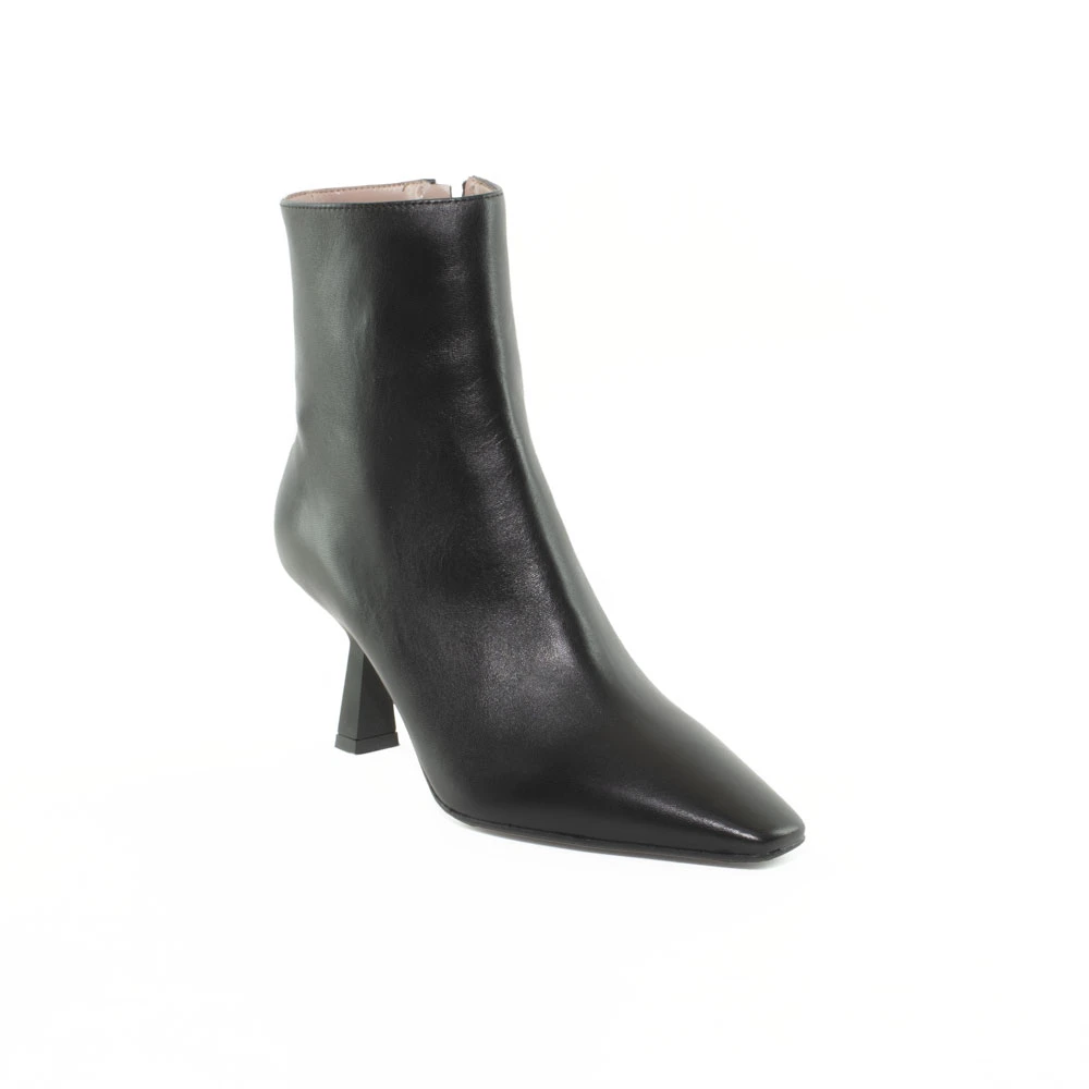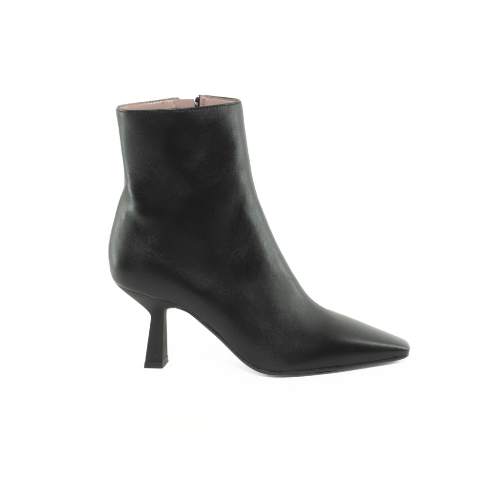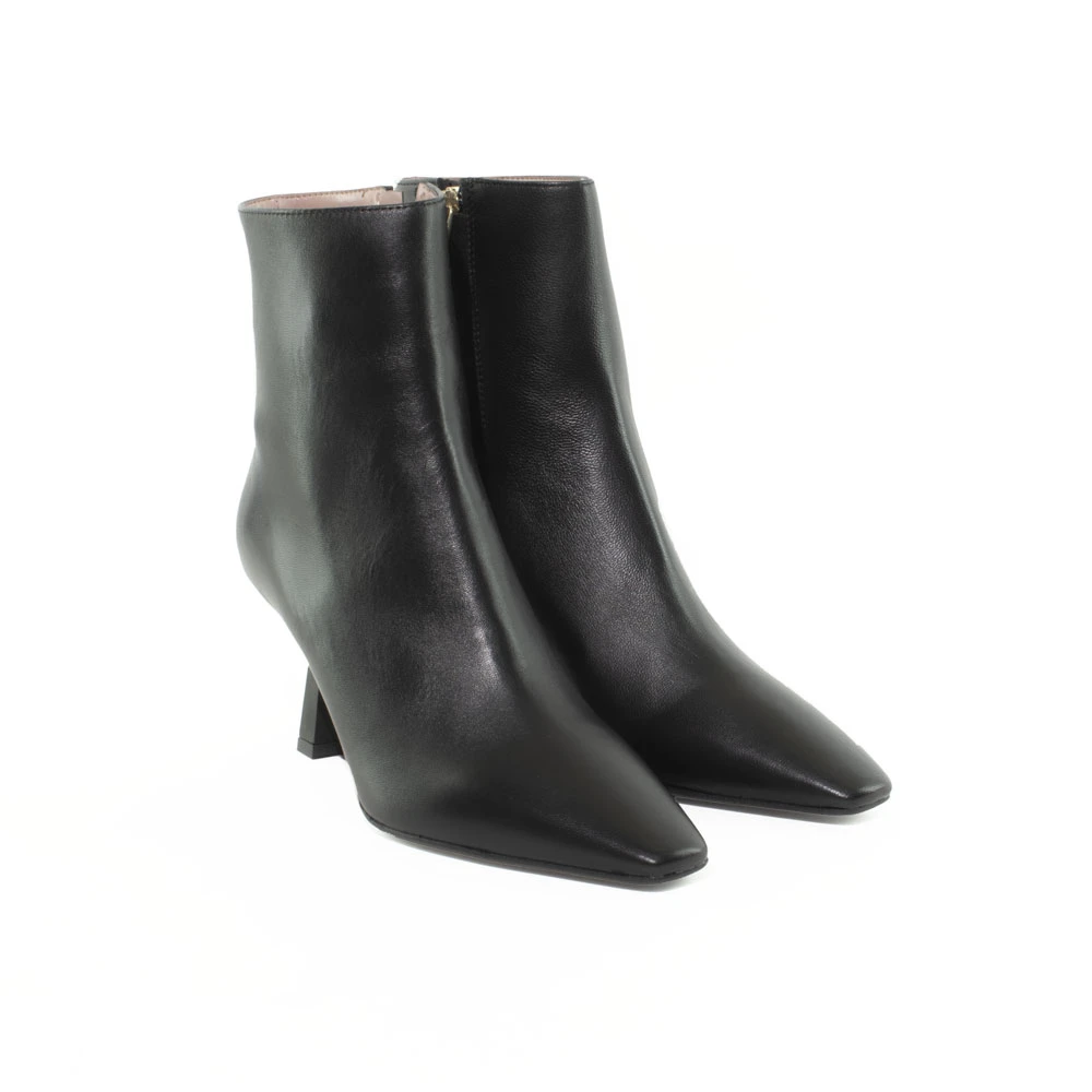 Stivaletti realizzati in morbida nappa con silhouette affusolata e tacco midi a rocchetto.