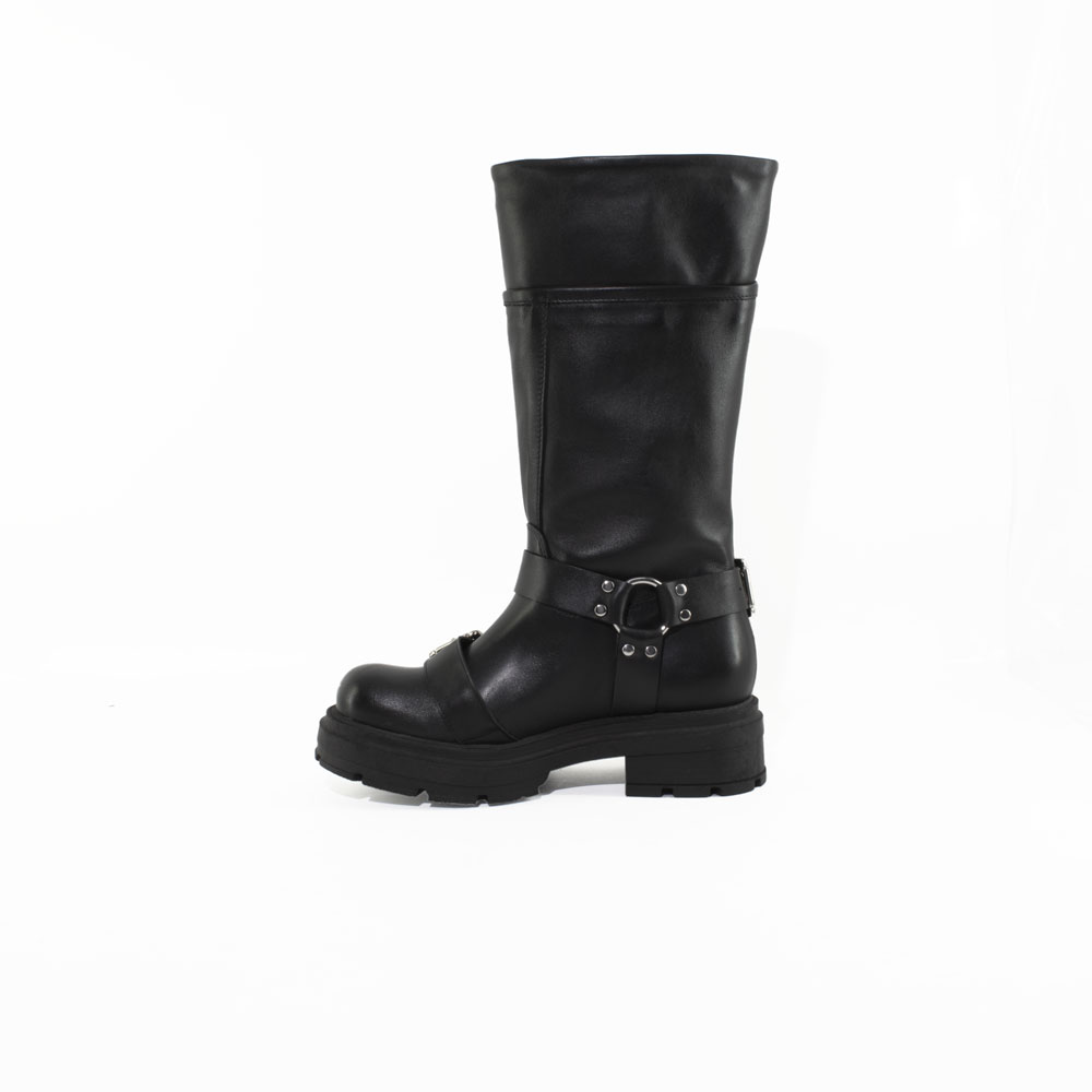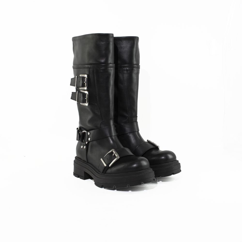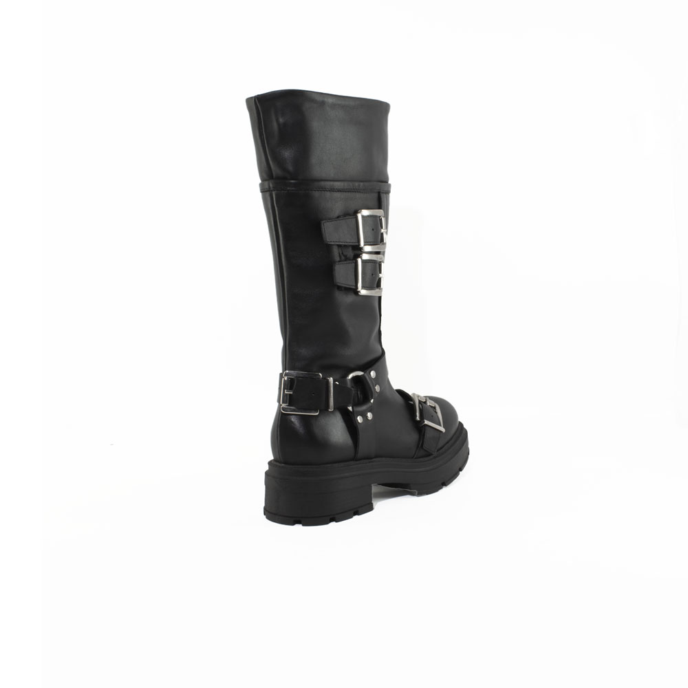 Modello biker realizzato in pelle, ideale nella stagione invernale da abbinare anche a maxi abiti. Caratterizzato da fibbie e borchie in argento satinato.