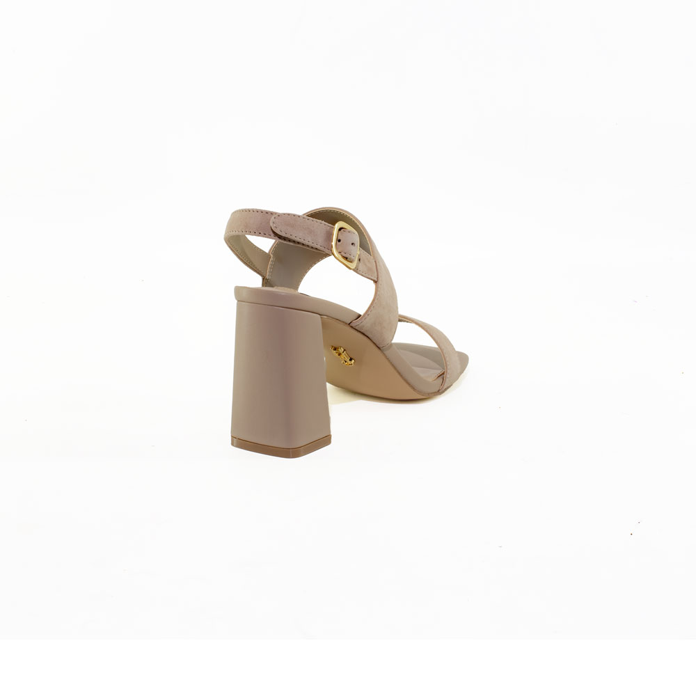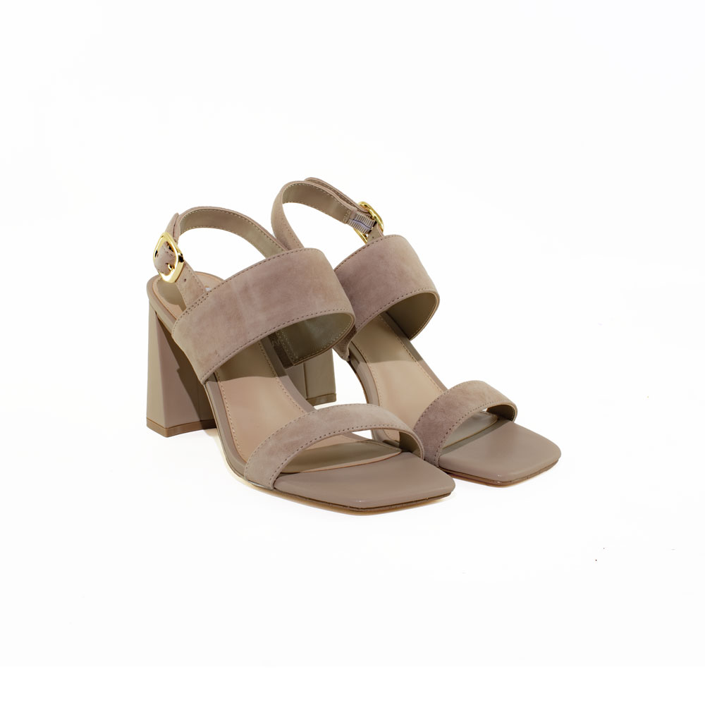 Sandali in pelle con tacco. Fasce rivestite in morbida pelle scamosciata e cinturino di chiusura alla caviglia.